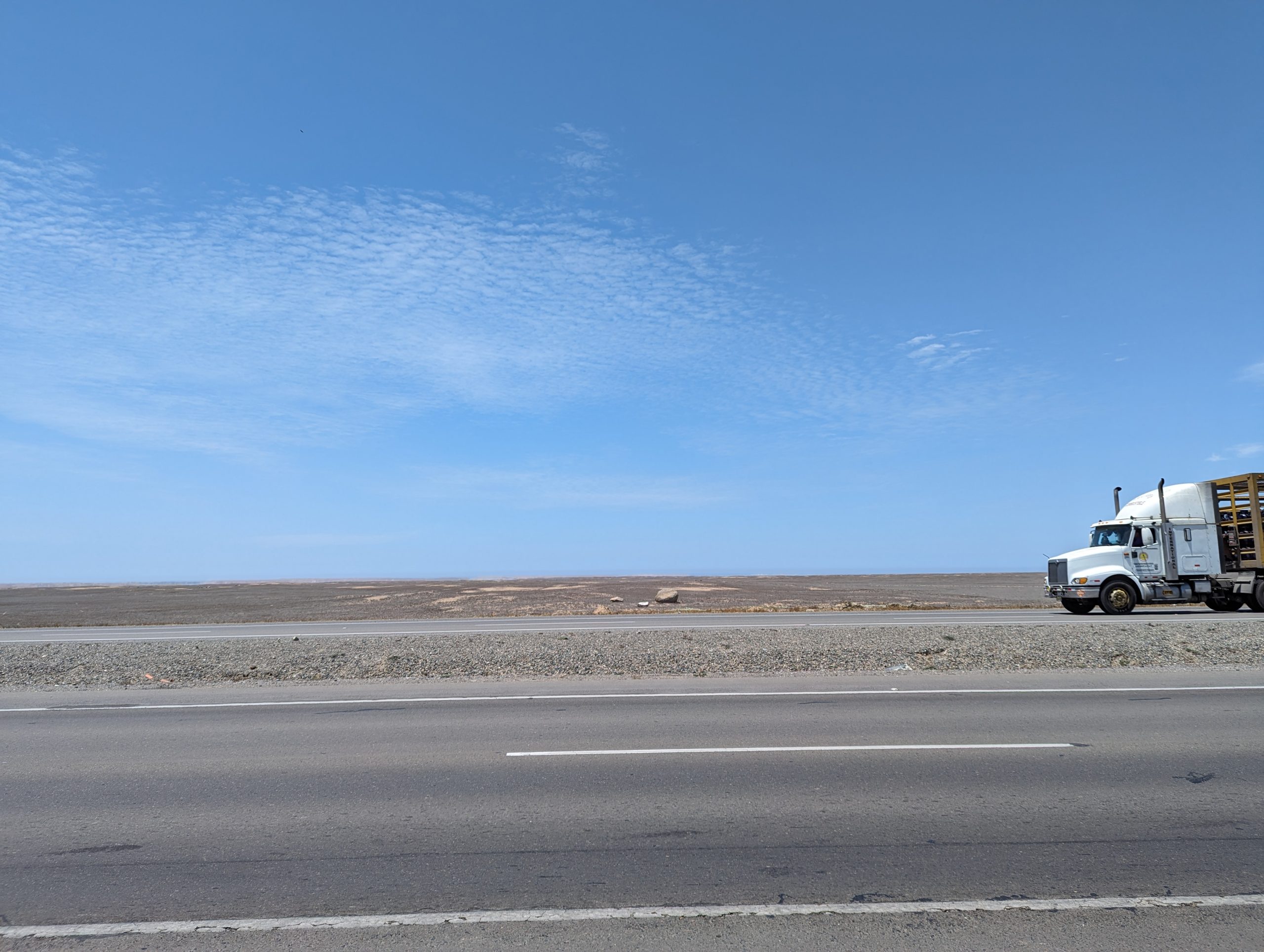 The rest of the day was the Via PANAM – 1N which is mostly a 4 lane motorway, being broken up by villages every once in a while. The landscape alternates between the desertlike landscape you can see above and the green patches where there is some water. The green patches are as well, where there are villages or small cities.