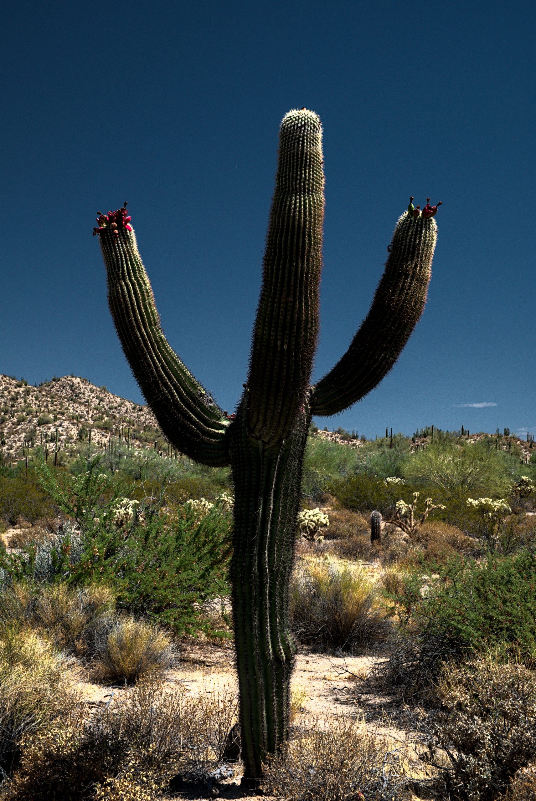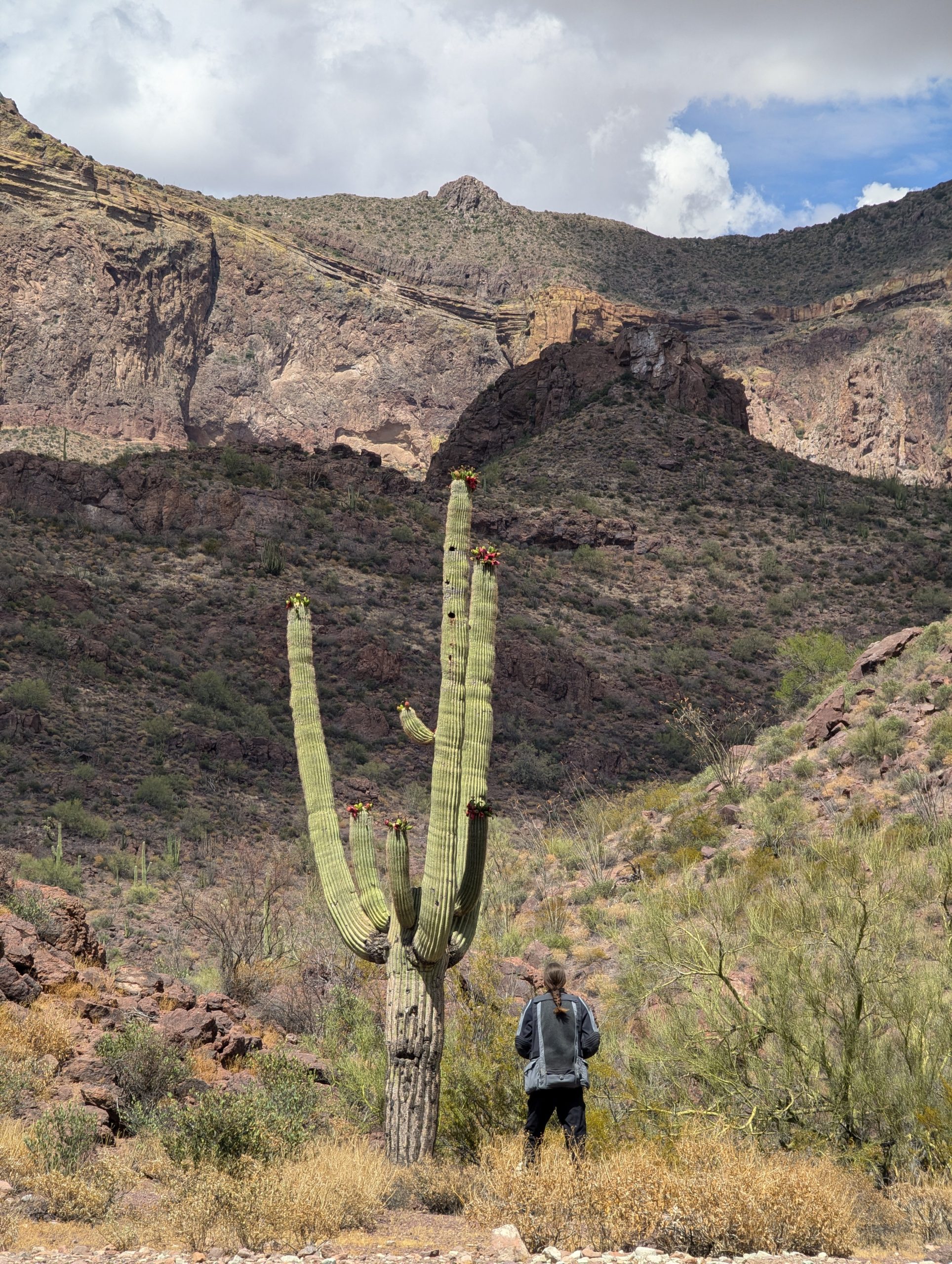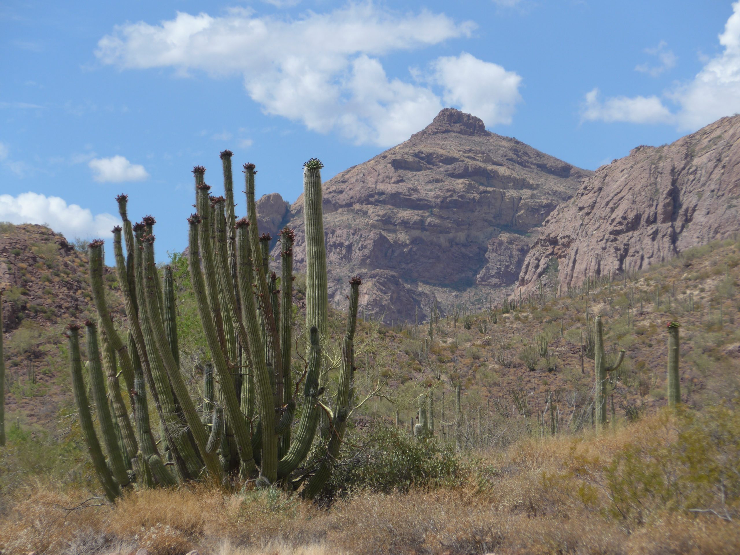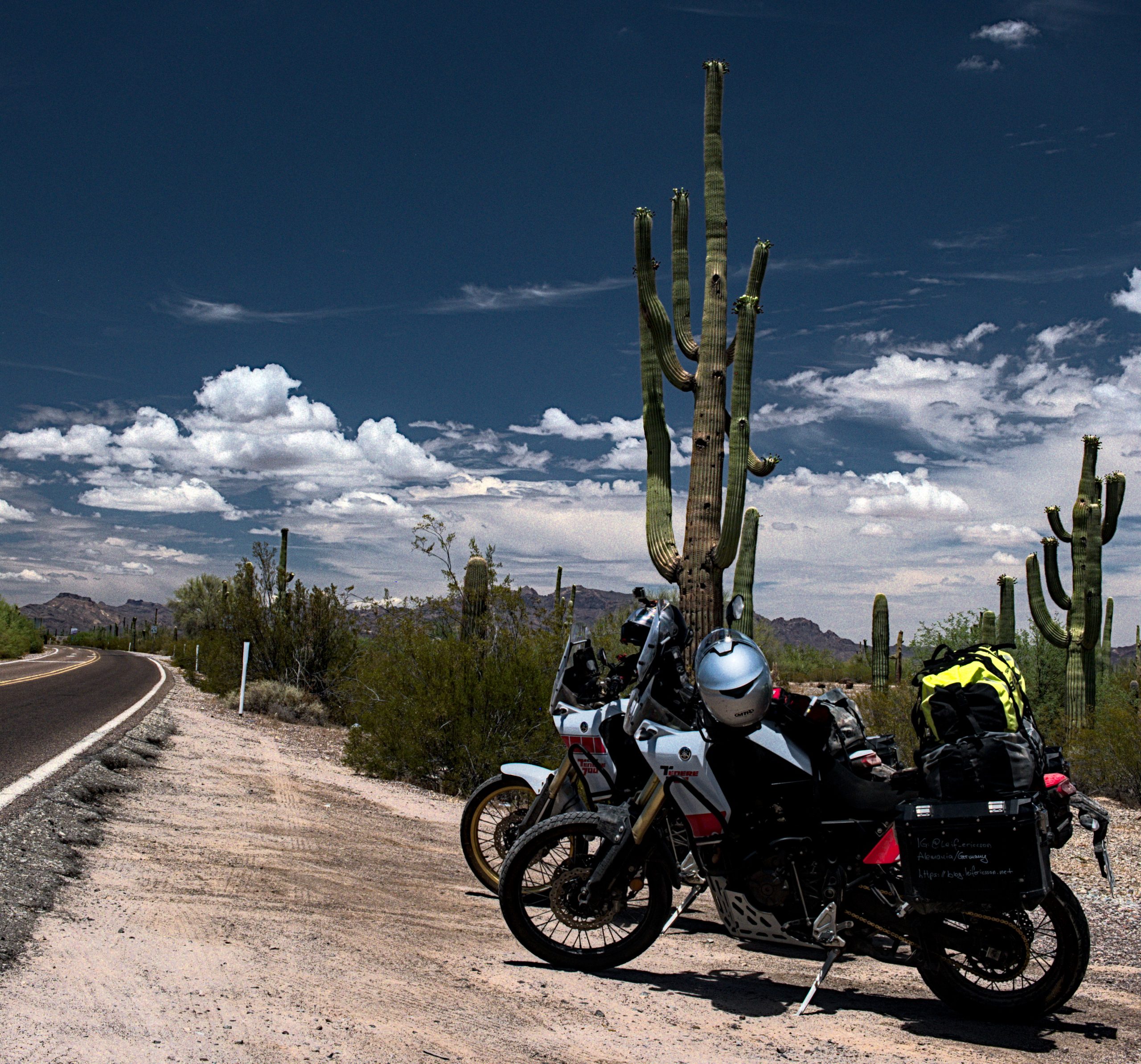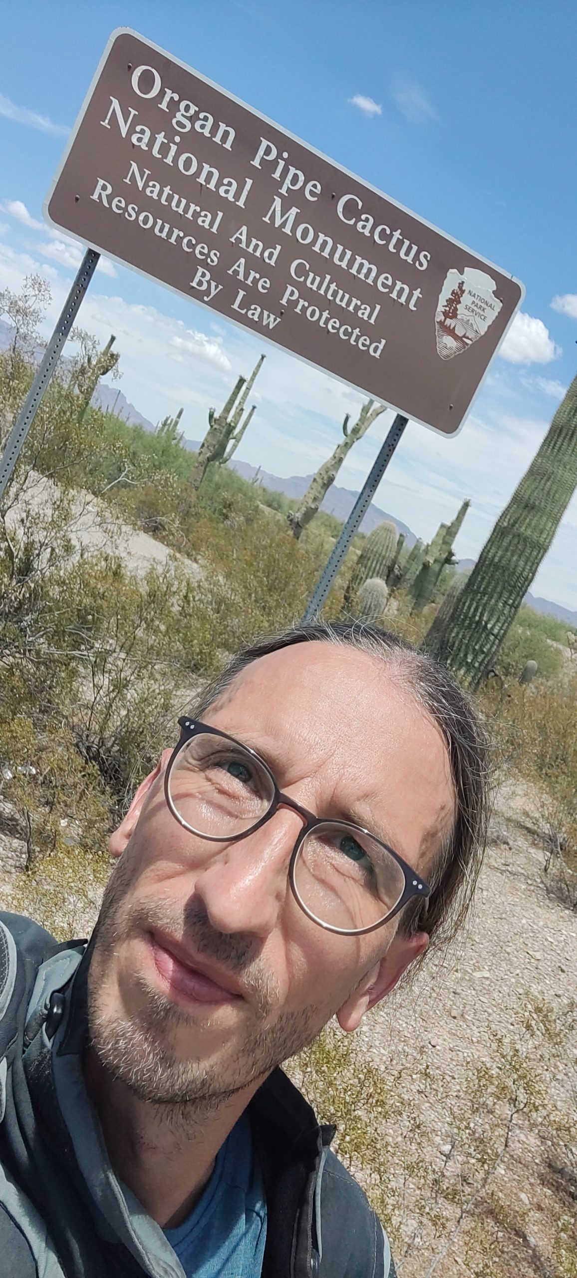 First thing we did after crossing the border was the “Organ Pipe Cactus National Monument”. We have read up before about the US national parks, and they do offer a seasonal pass – valid for a year – for 80.-$. We were just a bit unsure where to actually get one, we still do not know if they are sold in all national parks, but at least in this one they are sold and they are valid for all federal national parks. The park fee for a motorcycle would have been 25.-$ and as we are here for a bit, I am sure in the end we will have made a good deal. Stefan is a fan of cacti, so a few weeks back when I looked where to best cross the border I thought this park might be right up his alley. Yep I was right, was a bit like watching Alice in Wonderland ;-).