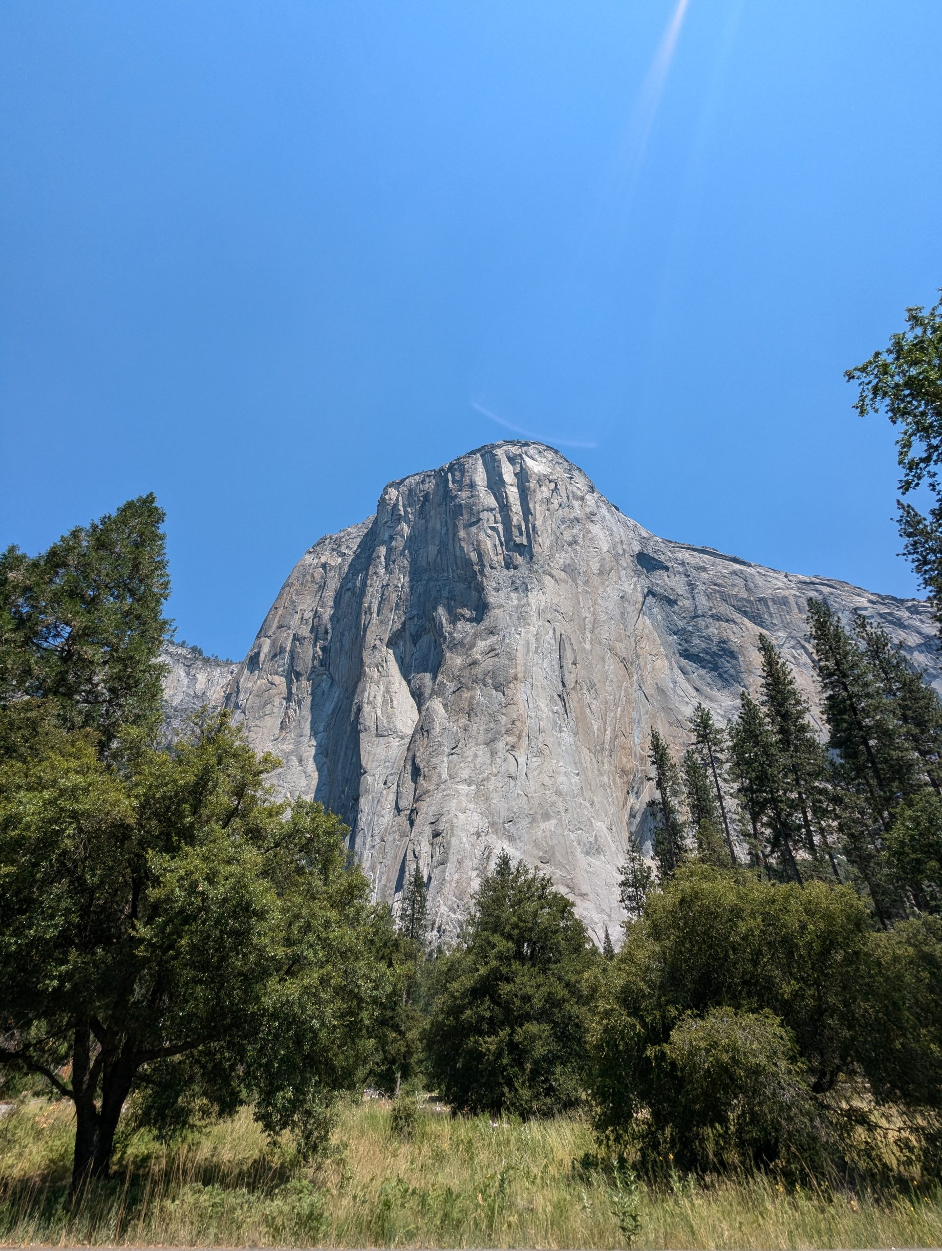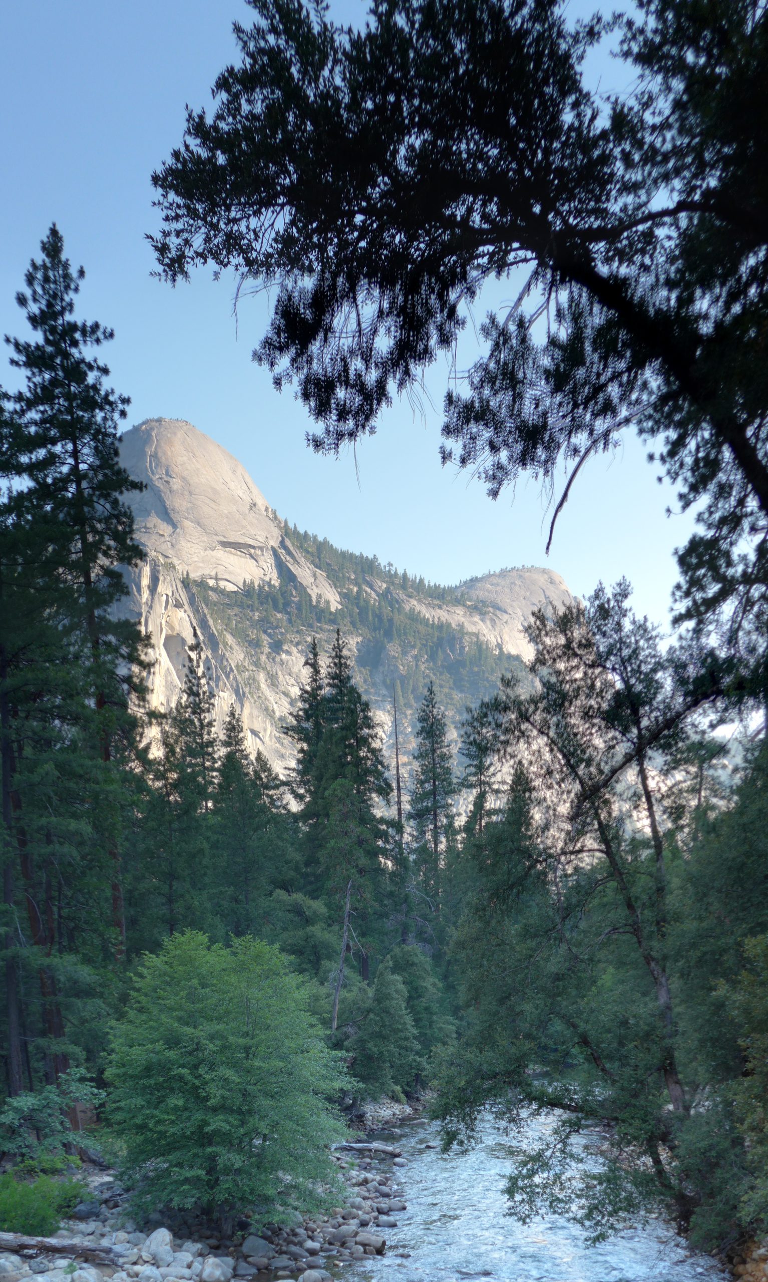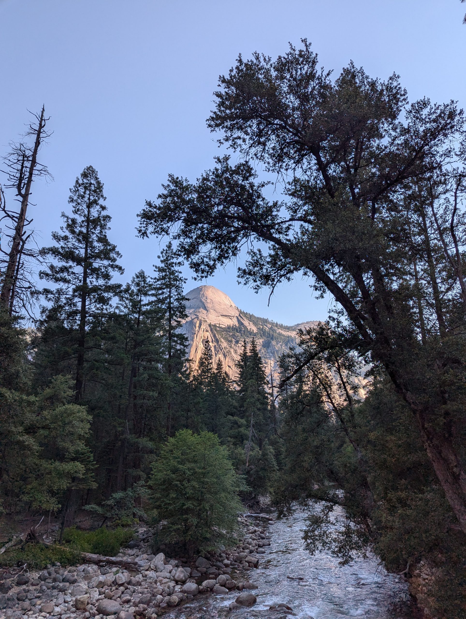 So you get into Yosemite, and at least in my head there were the pictures of El Capitan, the Half Dome at the far end. Pictures I got from “Alex Honnolds – Free Solo” and “Huber Buam – Speed”. So i was a bit disappointed by the 30 miles after the entrance, that it took to actually get to Yosemite valley. But man the tunnel view, so worth it. However it was late in the day, the ride was long and no tent was put up yet. So Stefan definitely did not enjoy that view as much as I did. In addition he is not necessarily a fan of blank rock as much as I am. We were camping at the Upper Pine Campground which is at the far end of the valley, right to the entry of the Misty and John Muir Trail. A little creek flowing not to far from the campground. Just thinking about that spot still sends shivers down my spine. The cool down phase in the river was really enjoyable.