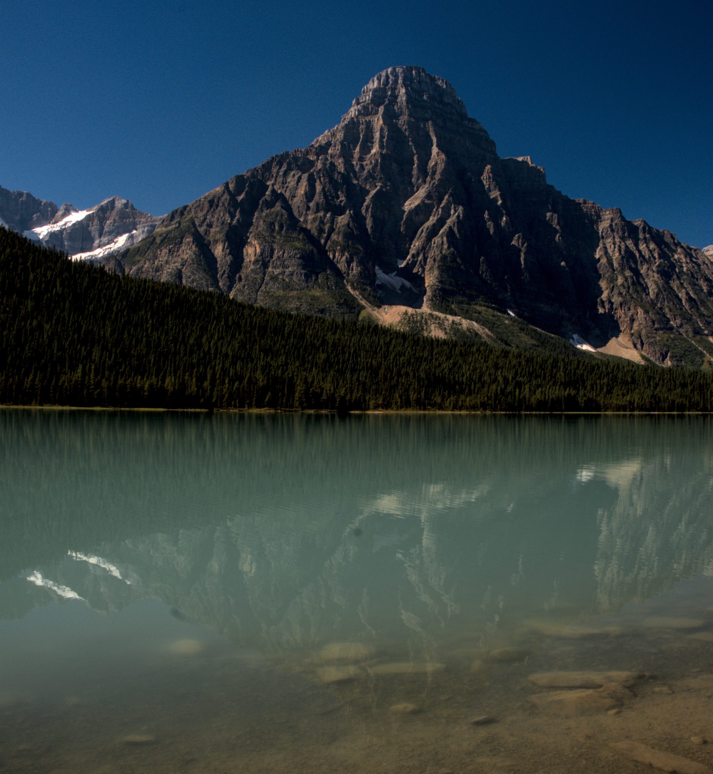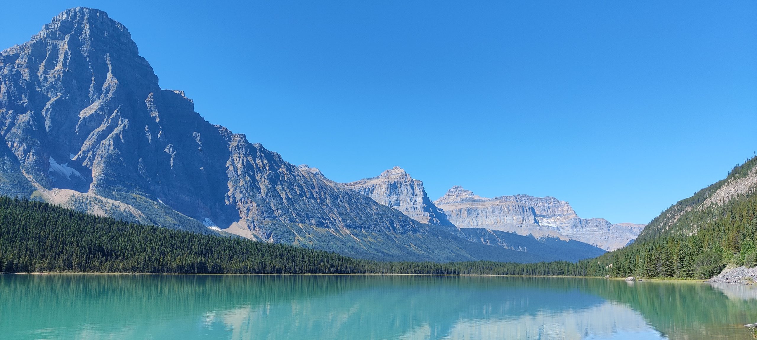 With only 186 km till Banff we started the morning slow. Back on the road at close to 11, with clear blue skies and the Rocky mountains all around us. The drive towards the junction hwy11/hwy93 was already spectacular, but that got even better once on hwy 93. High mountains, glaciers, glassy lakes, simply perfect. Well there are a lot of people on the road, and all the spits, like at Bow Lake – are pretty crowded, understandably so with the weather forecast for the weekend. The campground we are at – tunnel mountain village 1 – is rather large but quiet. we will be staying two nights and are going for a little hike tomorrow. Today´s ride already gave an inkling of what all the fuzz is about, when people speak about Banff. I expect tomorrow to be even better.