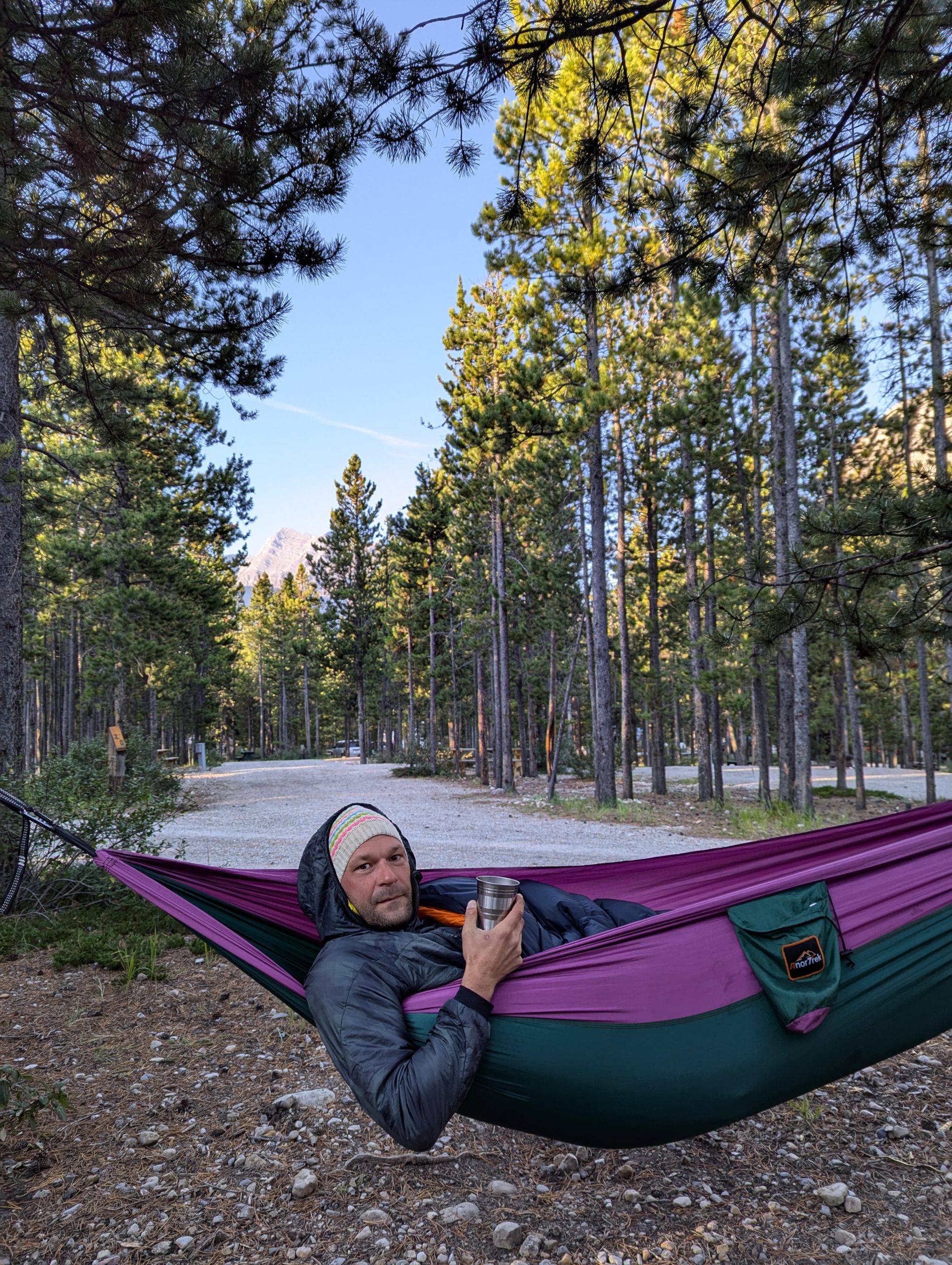 second day in a row getting up at 05:30. well the bike most probably needs maintenance, and on Saturdays the shop is only open till 4. sadly Stefan had to get up with me, ok half an hour later when coffee was ready, still quite early. But as i am packing the tent, well. i did leave him the hammock though and the morning was cold but as well sunny. By 0830 i was riding and by 0940 at the shop. The ride out of Banff was quite spectacular, well the Canadian Rockies are.