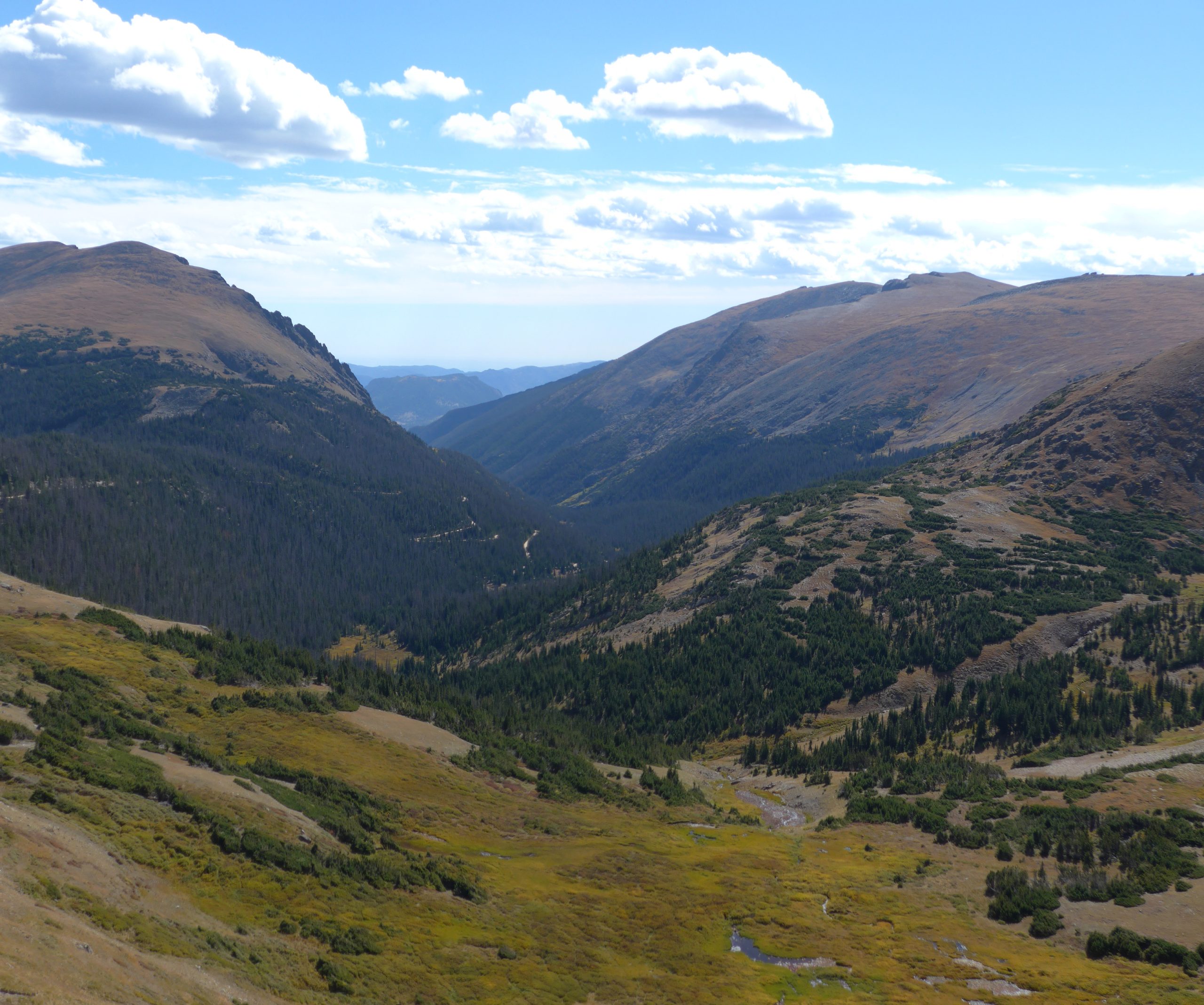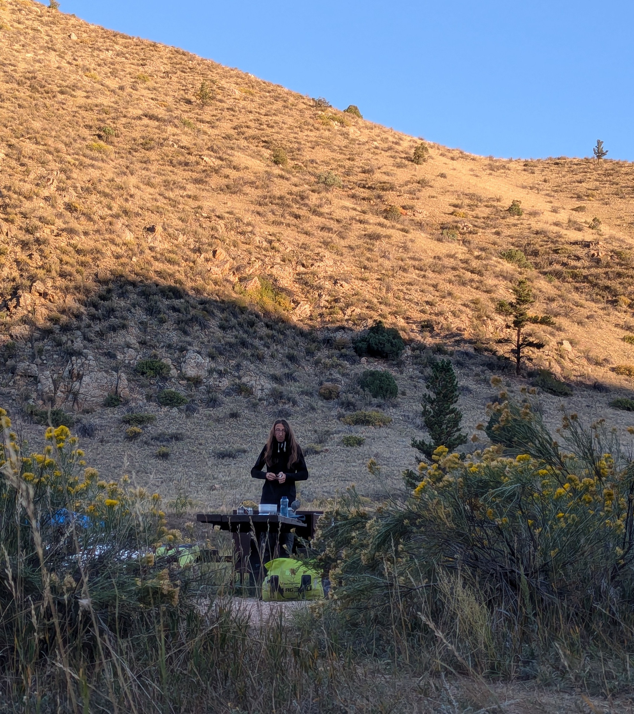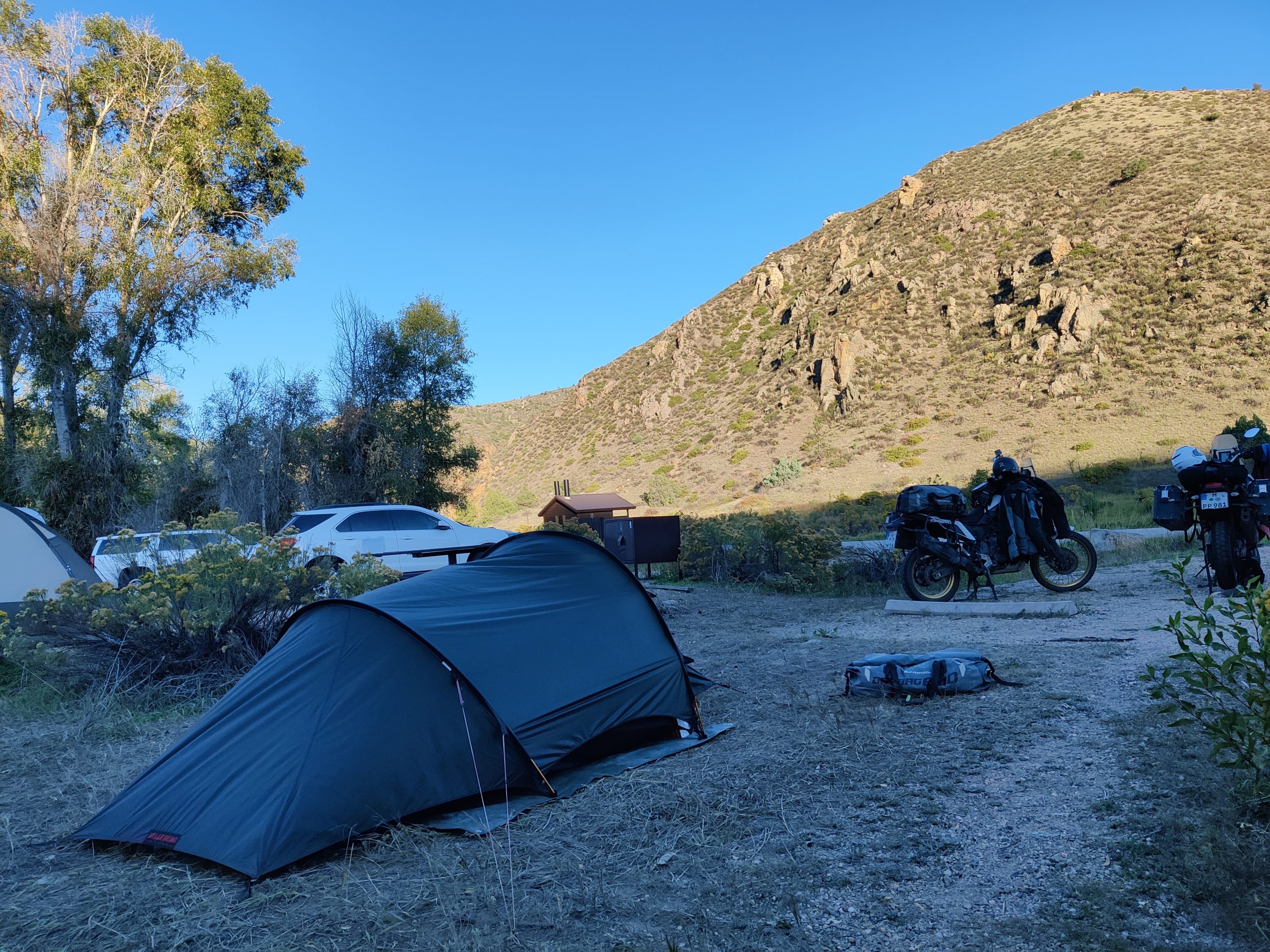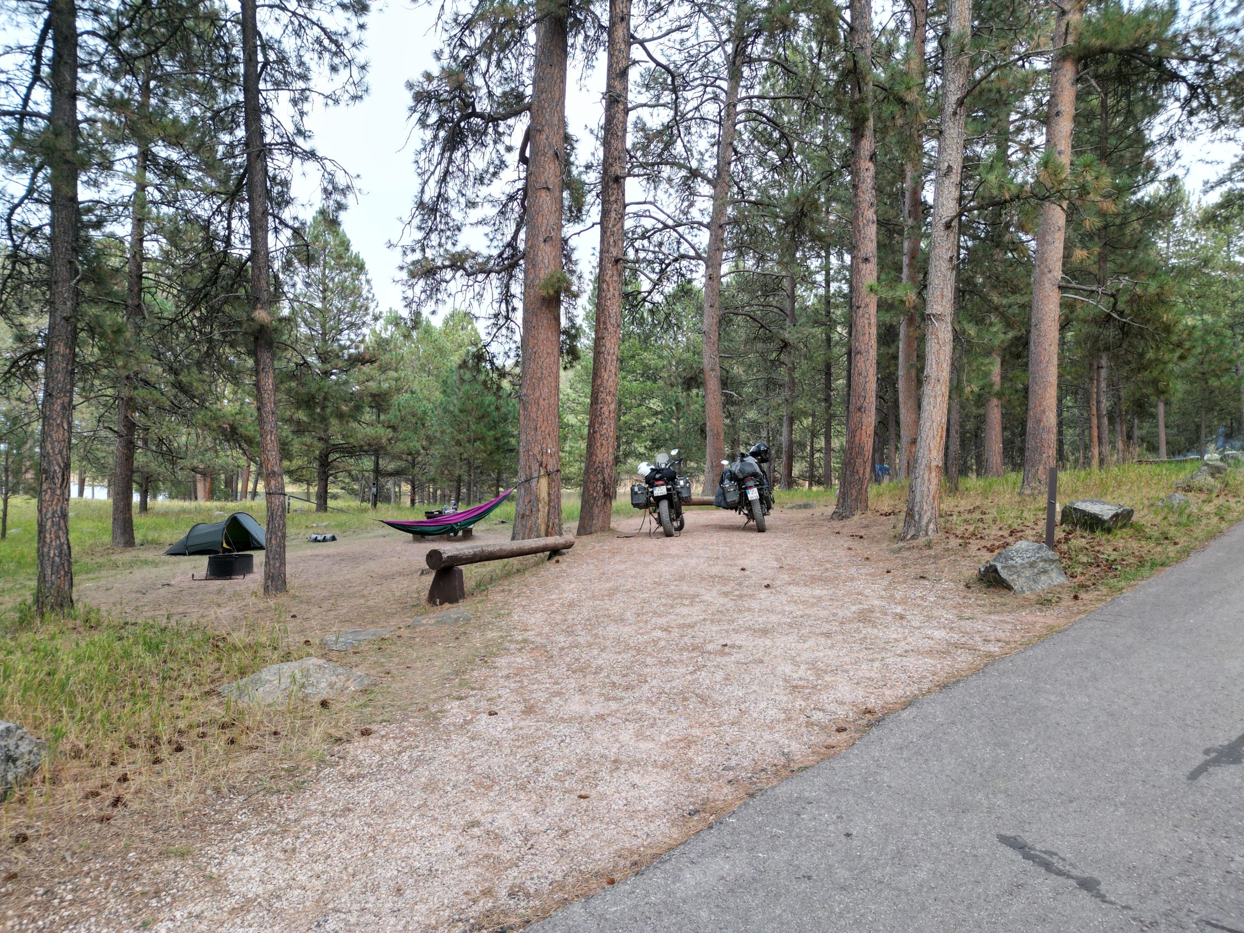 The ride through the Rocky Mountain national park was spectacular as expected, even though for Stefan he does not make it into the best of three US national parks thus far. It was the highest we have been in both Central and North America with clocking in at an elevation of 3700 m. After we cleared the park Stefan surprised me a bit eith stating that he ain”t going to ride for another 120 km and that we are going to look for a campground. The first two we looked at were fully booked but at the Dutch George Campground we got lucky. Next to a creek, this promises to be a good night. But first running. Turns out i ran for 12 km and all of that slightly below 6 min/km. I am quite happy with that. By the time we finished dinner the campground was full with people still looking for open spots.