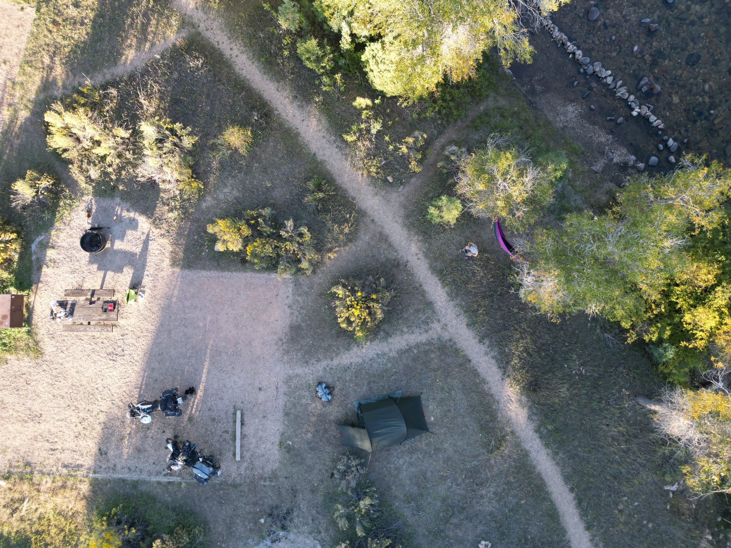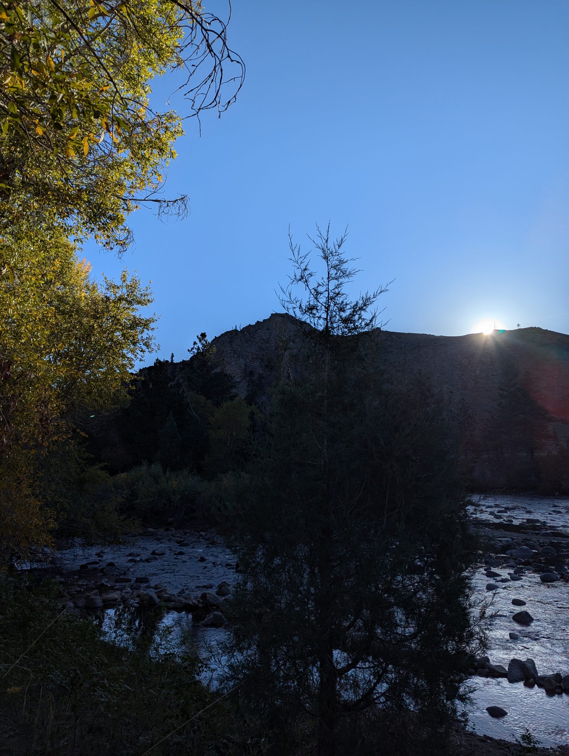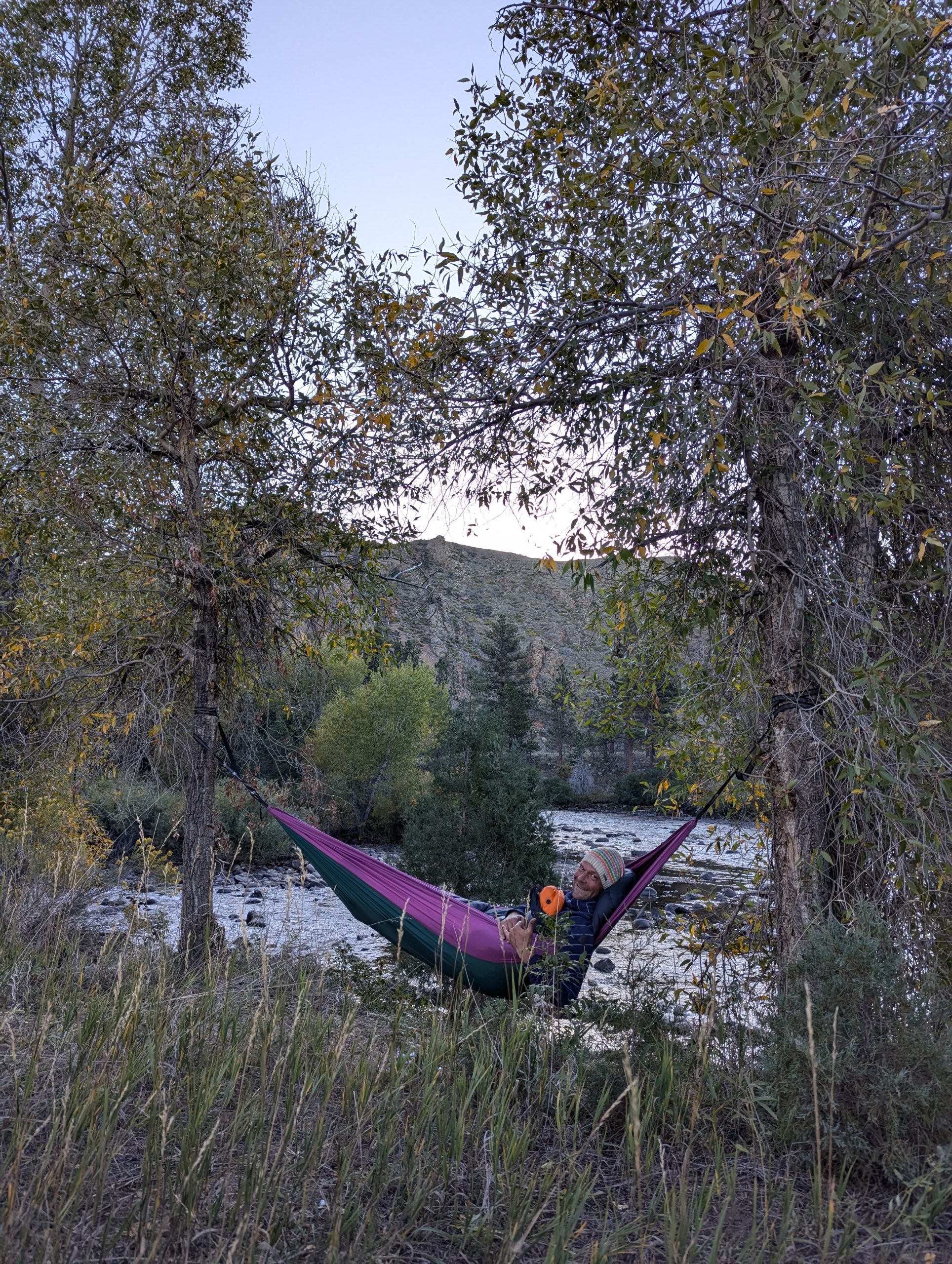 My morning started at 04:45. And after preparing a cup of coffee i moved with my sleeping bag into the hammock. This is where parts of this blog entry have been written. As sunrise is only at 06:45 i had about an hour of stars and the moon over me, and later on dawn. It was quite nice, but my fingers shere really frosty ;-). Riding the length of the valley alongside the creek was, well beautiful, and in addition we where able to observe the locals at one of there hobbies, fly fishing. Never could get the appeal of it, but quite a lot of people doing it here.